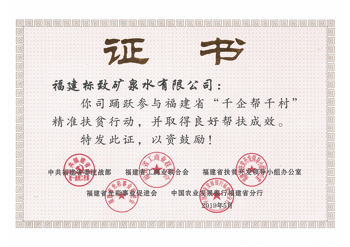 • 2020-05-132019年5月,標(biāo)致公司榮獲“踴躍參與福建省‘千企幫千村’精準(zhǔn)扶貧行動(dòng),并取得良好幫扶成效”的榮譽(yù)證書。